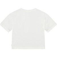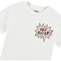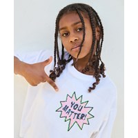 Weißes T-Shirt aus weicher Öko-Baumwolle mit geripptem Ausschnitt. Das T-Shirt hat eine lockere Passform mit Pailletten-Stickerei einer pinkfarbenen Sprechblase und dem Text 'You Matter'.