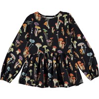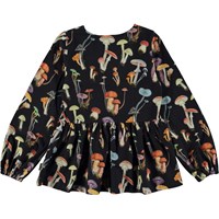 Schwarze langärmlige Schößchenbluse mit Allover-Pilzdruck. Der Druck besteht aus einer schönen Auswahl an Pilzen nach einem Herbstspaziergang im Wald. Grafisch, schön und einfach. Diese Bluse ist aus 100% Baumwolljersey, hat einen Rundhalsausschnitt, lange Ärmel mit Volumen und Gummizug am Abschluss, ein Rockdetail und eine normale Passform.