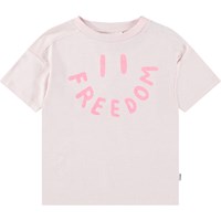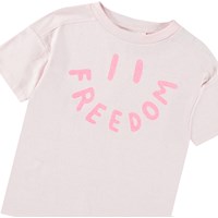 Pinkes T-Shirt aus weicher Öko-Baumwolle mit Rundhalsausschnitt und geripptem Saum. Das T-Shirt hat eine lockere Passform mit einem pinken lächelnden Gesicht auf der Vorderseite und dem Wort "Freedom" als Mund.