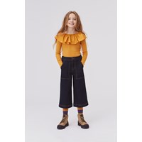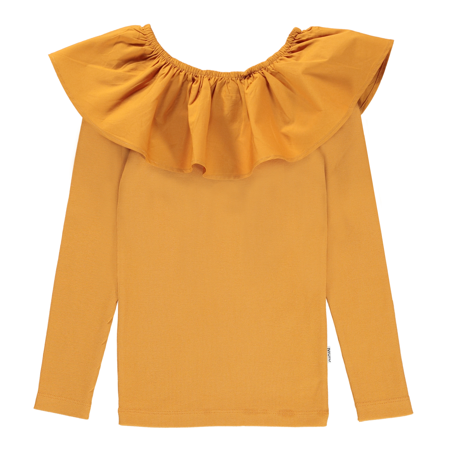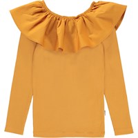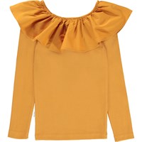 Renate ist eine goldene Langarm-Bluse in Ripp-Qualität mit großem Rüschenkragen, der entweder auf den Schultern sitzen oder ein wenig nach unten gezogen werden kann, damit die Schultern frei sind.
