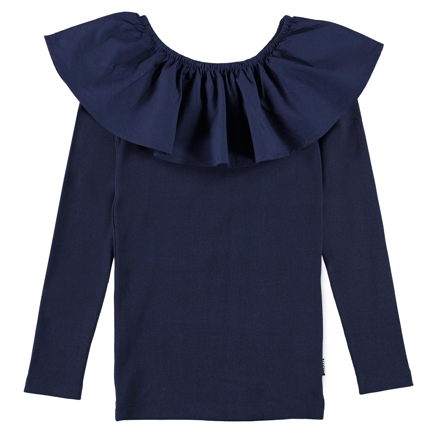Renate ist ein dunkelblauer Langarm-Pullover in Rippqualität mit einem großen Rüschenkragen, der entweder auf den Schultern sitzt oder ein wenig nach unten gezogen werden kann, damit die Schultern frei sind.