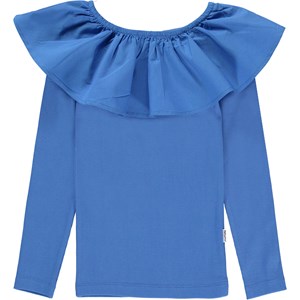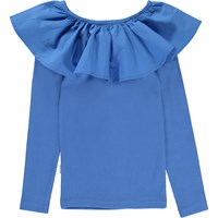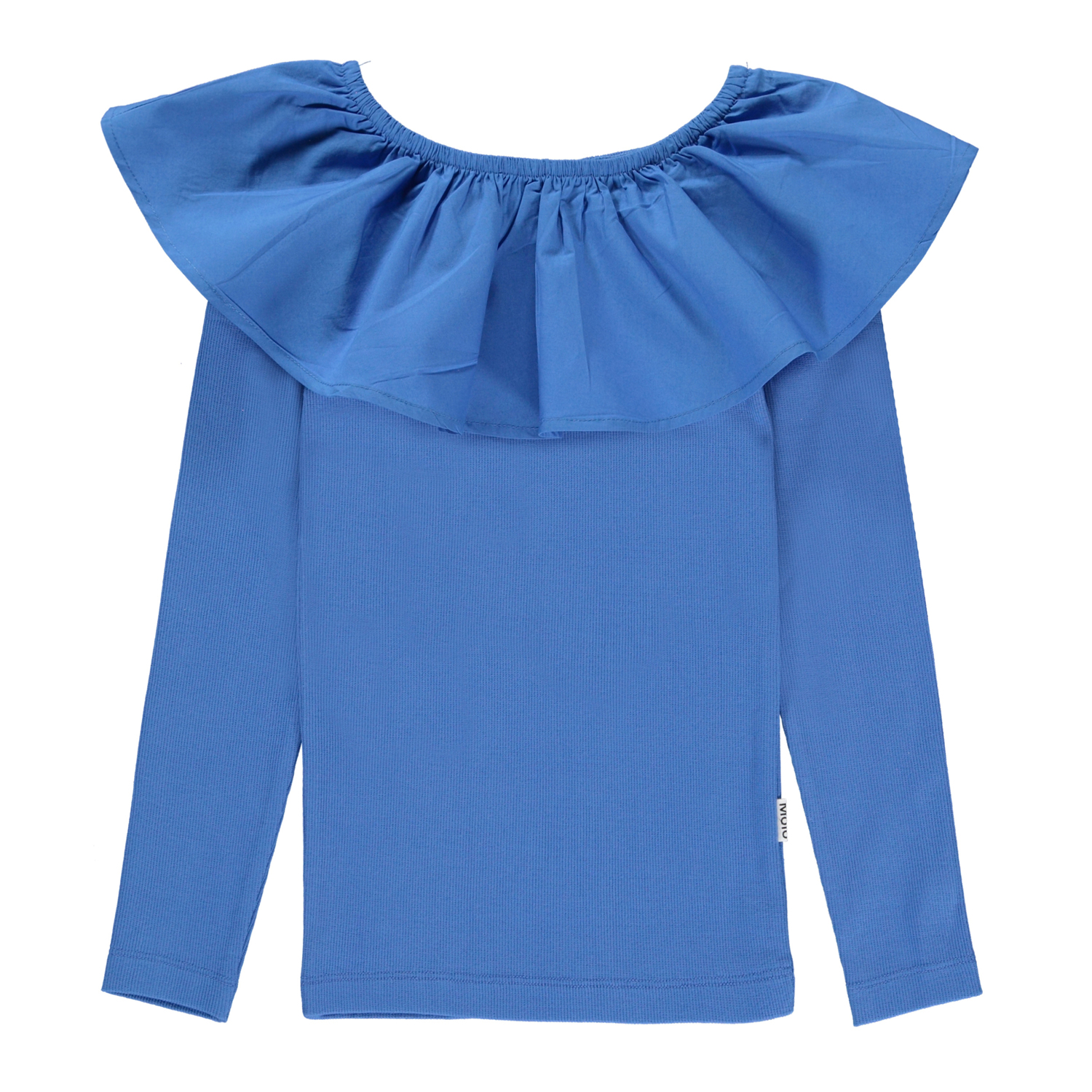 Renate ist eine blaue Langarmbluse in Ripp-Qualität mit großem Rüschenkragen, der entweder auf den Schultern sitzen oder ein wenig nach unten gezogen werden kann, damit die Schultern frei sind.