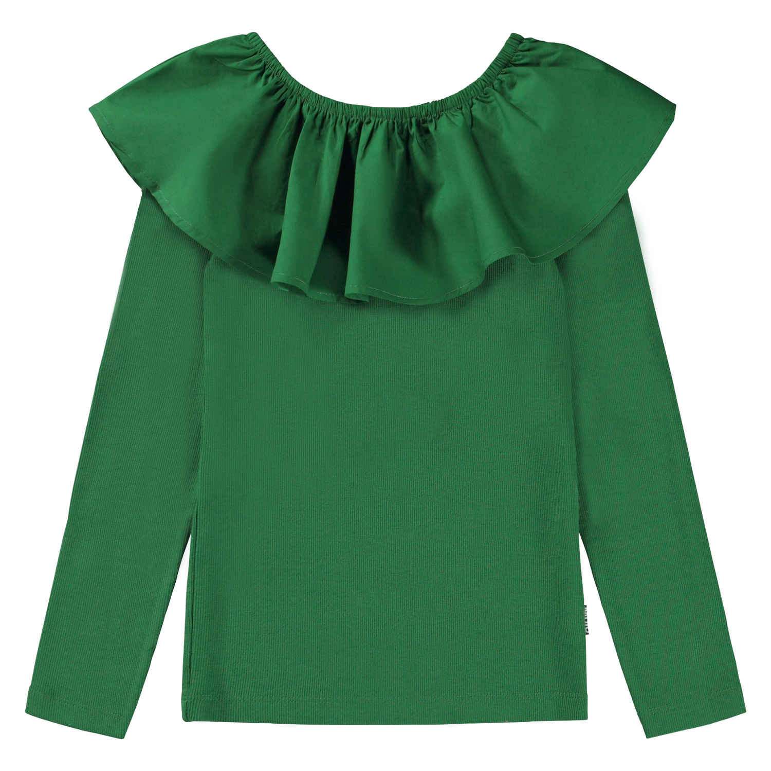 Grünes Langarm-Top mit Popeline-Kragen. Der Popeline-Kragen ist elastisch und kann schulterfrei oder hochgezogen getragen werden, sodass sowohl der Kragen als auch der Ärmel funktionieren. Dieses Oberteil besteht zu 100% aus Baumwolle und einem Kragen aus 100% Baumwollpopeline, langen Ärmeln und einer schmalen Passform. Ein lustiges und vielseitiges Oberteil für jeden Anlass.