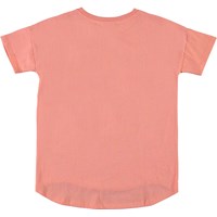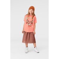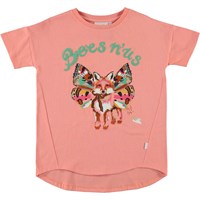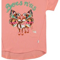 Renessa ist ein korallenfarbenes T-Shirt mit einer leicht weiten Passform. Auf der Vorderseite des T-Shirts befindet sich ein Druck eines Fuchses mit Flügeln.