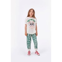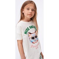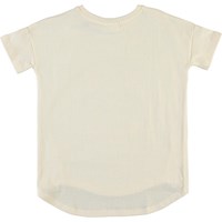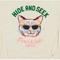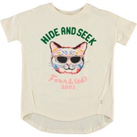 Renessa ist ein helles T-Shirt mit Druck von einer Katze mit Sonnenbrillen und dem Text 'Hide and Seek' auf der Vorderseite. Das T-Shirt hat mehr Länge auf der Rückseite. Ecocert Greenlife, certifikationsnr. 197496.