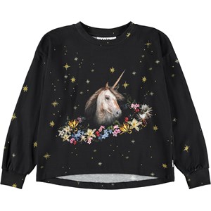 Schwarzes Langarmshirt aus weicher Bio-Baumwolle mit gerippten Bündchen und Ausschnitt. Das Langarmshirt hat eine lockere Passform und ist hinten länger geschnitten. Es ist mit goldenen Sternen bedruckt und zeigt ein weißes Einhorn mit einem bunten Blumenkranz um den Hals.