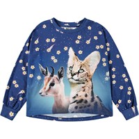 Hellblaue langärmelige Bluse aus Öko-Baumwolle mit lockerer Passform, Rundhalsausschnitt und gerippten Kanten. Die Bluse ist hinten länger als vorne. Auf der Vorderseite befindet sich ein Druck eines fröhlichen Hundes, der aus der Bluse springt, umgeben von bunten Schmetterlingen.