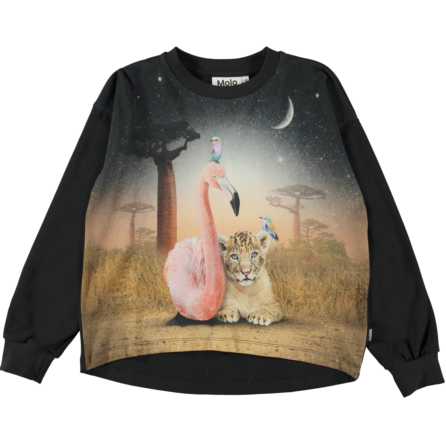 Reniza ist eine schwarze Bluse aus Öko-Baumwolle. Reniza hat einen Saum auf der Rückseite und die Vorderseite ist im Flamingo- und Cub-Print, wo ein Flamingo und ein Leopardenjunges gemeinsam den wunderschönen Nachthimmel der Savanne genießen.