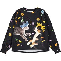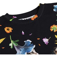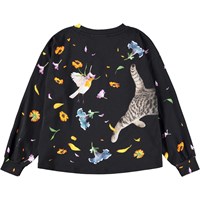 Schwarzes Oberteil aus weicher, ökologischer Baumwolle mit Rundhalsausschnitt und gerippten Kanten an den Ärmeln und am Hals. Das Oberteil hat eine lockere Passform, ist hinten länger und hat einen verspielten Druck von einem Hund und einer Katze in einem Blumenregen.