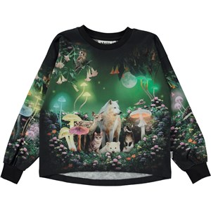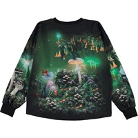 Schwarzes Shirt mit Placement-Print in Grüntönen. Der Druck zeigt, was nachts im Garten des Mondes passiert. Ein Garten, in dem die Blumen nur blühen, wenn die Sonne untergeht. Blumen mit Namen wie Königin der Nacht, Mondblume, Engelstrompete, Nachtkerze und Nachtjasmin. Ein Ort, an dem sich die Tiere aus den Abenteuern aufhalten. Wolf und Lamm, Eule und Motte, Eisbär und grünäugige Katzen. Kaninchenbabys und Kitze. Riesige Pilze, so groß wie Bäume, und die Luft voller Geräusche der Nacht. Entdecke die Goblincore-Mode und verkleide dich als eines der Kinder des Waldes, wie ein Kitz, ein Baumspross oder ein Rotkehlchen. Dieses Shirt ist aus 100% Baumwolle, hat lange Ärmel mit Rippbündchen, einen Rundhalsausschnitt mit Rippbündchen und eine lockere Passform.
