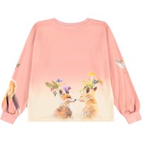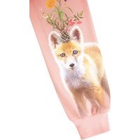 Rosa und cremefarbenes Langarmshirt aus weicher Bio-Baumwolle mit gerippten Bündchen und Ausschnitt. Das Langarmshirt hat eine lockere Passform und ist hinten länger geschnitten. Es zeigt einen Druck von Füchsen mit farbenfrohen Tannenzapfen, Zweigen, Blumen und Möwen der Natur.
