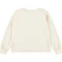 Off-weißes Langarmshirt aus weicher Bio-Baumwolle mit gerippten Bündchen und Ausschnitt. Das Langarmshirt hat eine lockere Passform und ist hinten länger geschnitten. Auf dem Langarmshirt ist ein niedliches Pom-Hund-Motiv in goldenen Farben gedruckt.