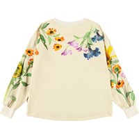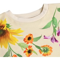Beiges Oberteil aus weicher, ökologischer Baumwolle mit rundem Ausschnitt und gerippten Kanten an den Ärmeln und am Hals. Das Oberteil hat eine lockere Passform, ist hinten länger und hat einen Druck von bunten Sommerblumen.