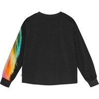 Schwarzes Langarmshirt aus Öko-Baumwolle mit lockerer Passform, Rundhalsausschnitt und gerippten Kanten. Das Shirt ist hinten länger als vorne. Ein Regenbogen-farbenes Pferde-Print ziert den linken Ärmel und die Vorderseite des Shirts.