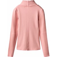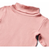 Rosa langärmeliges Oberteil für Kinder aus dehnbarem, weichem Viskose-Baumwoll-Rippstrick mit einer eng anliegenden Passform, einem Rollkragen, rohen Kanten und sichtbaren Nähten.