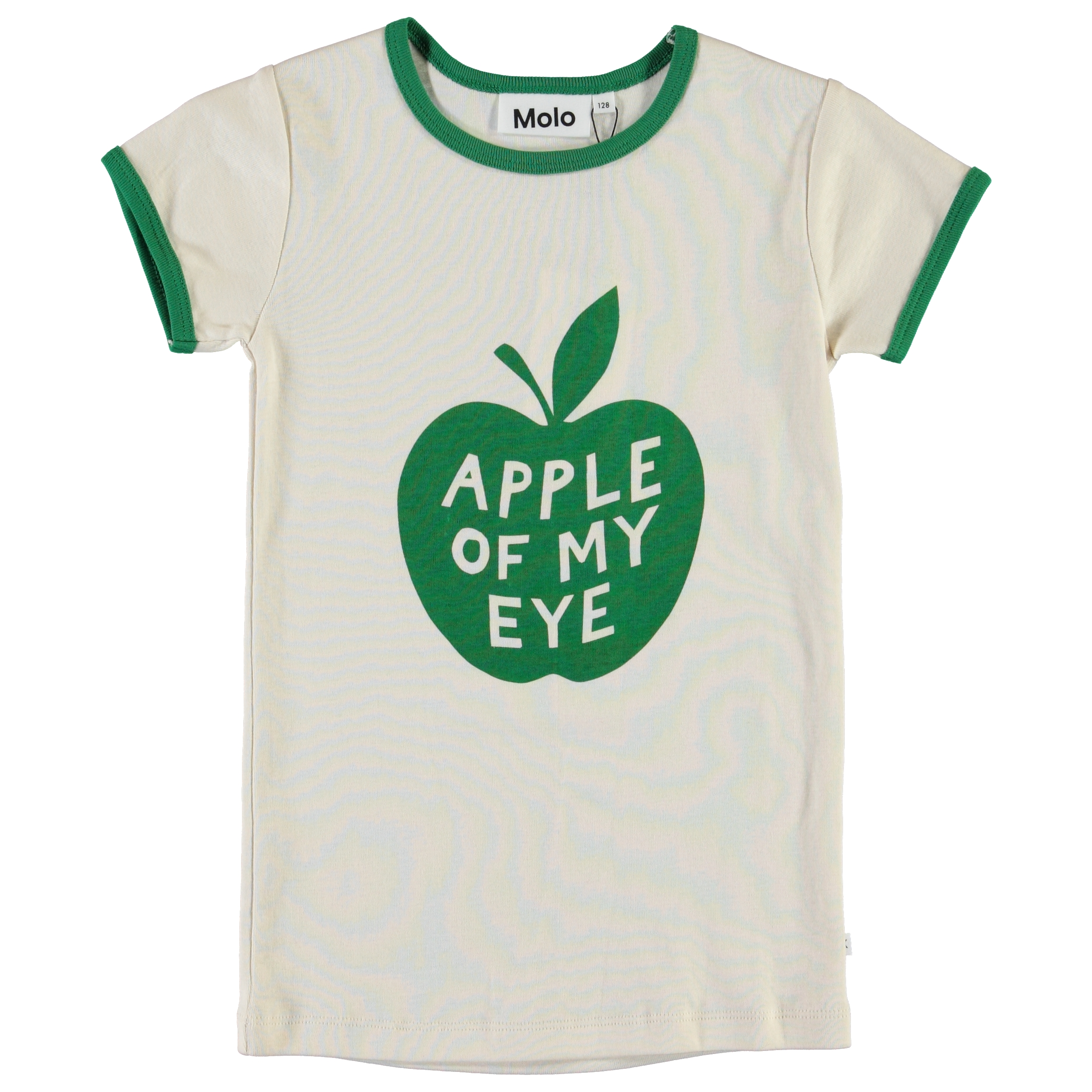 Apple of my heart' ist die Aussage in dem grünen Apfel hier auf dem Rhiannon-T-Shirt. Das T-Shirt ist ein weißes T-Shirt mit grünen Rändern an den Ärmeln und der Halsöffnung.