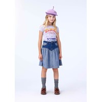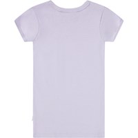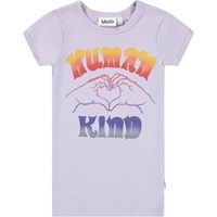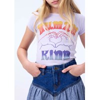 Lila kurzärmeliges T-Shirt aus weicher Öko-Baumwolle mit dem Text ''Human Kind'' und Händen, die auf der Vorderseite ein Herz formen. Das T-Shirt ist figurbetont, hat einen Rundhalsausschnitt und einen Saum in passender Farbe.