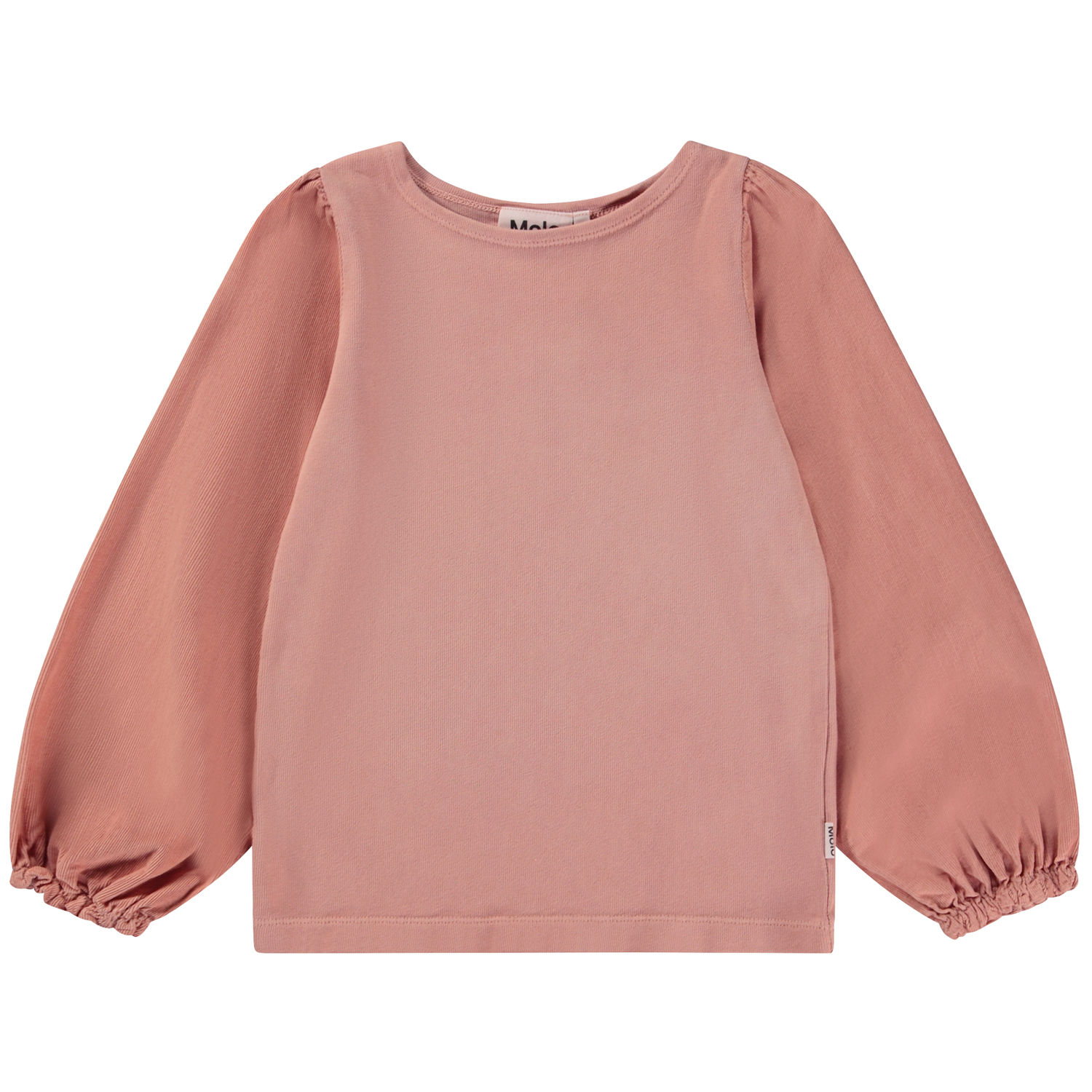 Rosafarbene Bluse mit Puffärmeln aus Baumwollpopeline. Diese Bluse ist aus 100% Baumwolle, hat einen Rundhalsausschnitt mit gerippten Bündchen, lange Ärmel mit Puff und elastischem Bund und eine reguläre Passform.