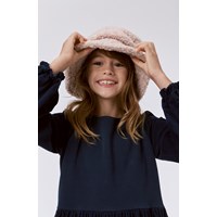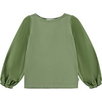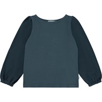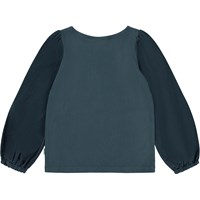 Dunkelblaue Bluse mit Puffärmeln aus Baumwollpopeline. Diese Bluse ist aus 100% Baumwolle, hat einen Rundhalsausschnitt mit gerippten Bündchen, lange Ärmel mit Puff und elastischem Bund und eine reguläre Passform.