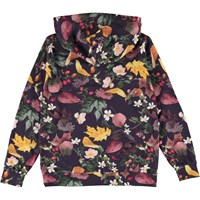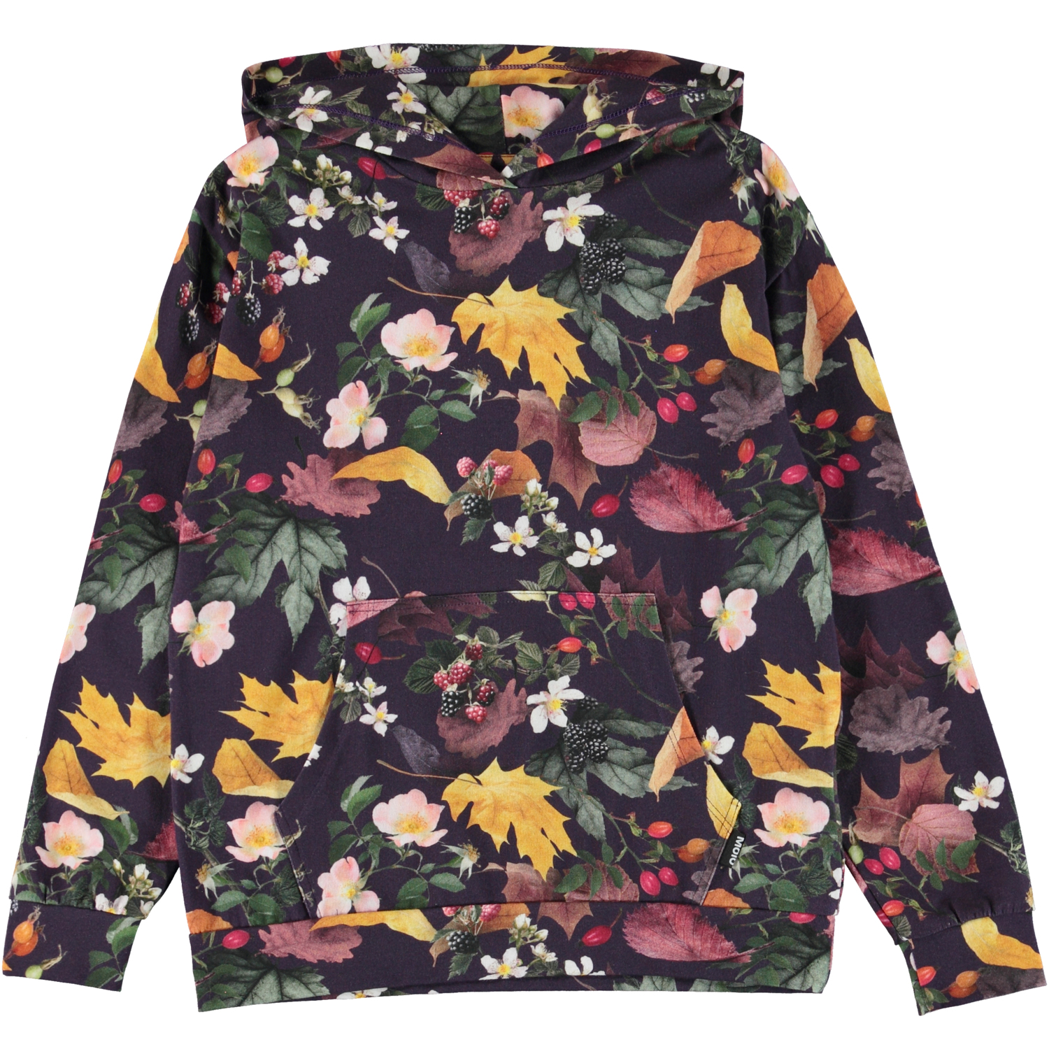 Rhona ist ein Hoodie mit langen Ärmeln und einer Kängurutasche auf der Vorderseite. Der Hoodie ist lila mit einem Aufdruck aus bunten Brombeerranken.