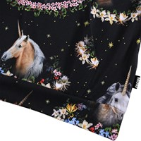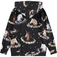 Schwarzer Hoodie aus weicher, biologischer Baumwolle mit einem Druck von Pegasi mit bunten Blumenkränzen. Der Hoodie hat eine lockere Passform, eine Kängurutasche und lange Ärmel mit gerippten Bündchen und Saumkante.