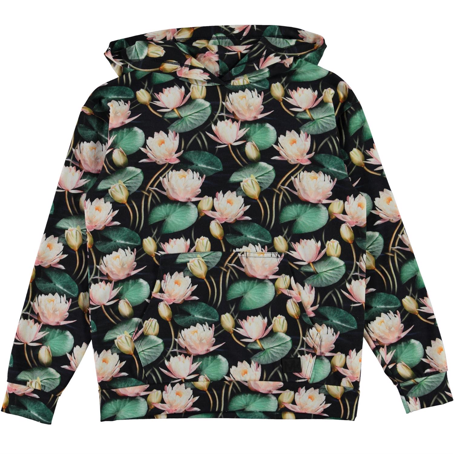Rhona ist ein Hoodie mit einem Druck von Seerosen. Die Bluse hat eine schöne dünne Qualität und eine Känguru-Tasche auf der Vorderseite.