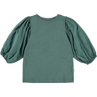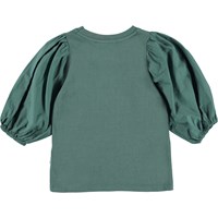 Rica ist eine grüne Bluse mit großen Puffärmeln, die in der Mitte der Arme enden.