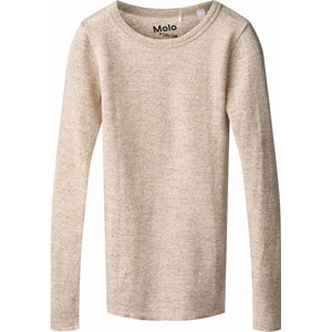 Beige melange, langärmeliges Oberteil aus weicher Merinowolle mit enganliegendem Schnitt, Rundhalsausschnitt und Babylock-Details an den Ärmeln und am Saum. Kombinieren Sie es mit passenden Leggings in derselben Farbe für ein komplettes Set.