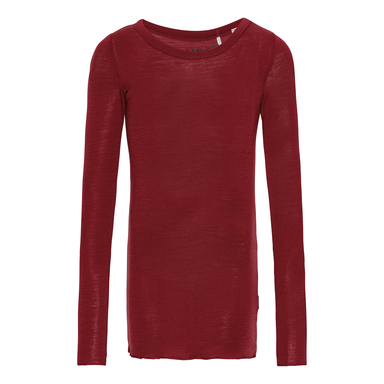 Bordeaux langärmelige Bluse aus Merinowolle mit enganliegender Passform, Rundhalsausschnitt und Bündchen an den Ärmeln und am unteren Saum der Bluse. Kombinieren Sie sie mit Leggings in derselben Farbe für ein komplettes Set.