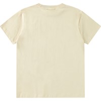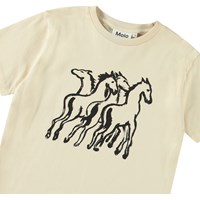 Weißes T-Shirt aus weicher Öko-Baumwolle mit kurzen Ärmeln und geripptem Ausschnitt. Das T-Shirt hat eine lockere Passform und einen Frontdruck von handgezeichneten Pferden in einer Herde.