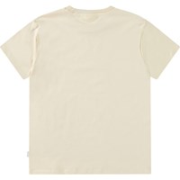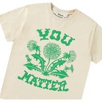 Off-weißes T-Shirt aus weicher Öko-Baumwolle mit kurzen Ärmeln und geripptem Ausschnitt. Das T-Shirt hat eine lockere Passform und einen grünen Frontdruck von Löwenzahn und dem Text 'You Matter'.