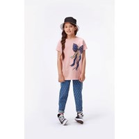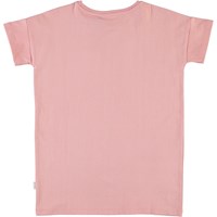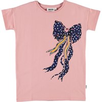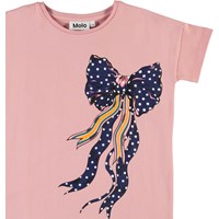 Rilla ist ein rosa T-Shirt mit kurzen Ärmeln und ein Druck von einer blau-gepunktenen Schleife auf der Vorderseite. Ecocert Greenlife, certifikationsnr. 197496.