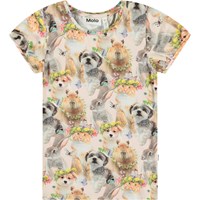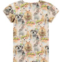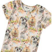 Pinkes figurbetontes T-Shirt aus weicher Öko-Baumwolle mit einem Rundhalsausschnitt und kleinen kurzen Puffärmeln. Das T-Shirt zeigt ein Allover-Print von niedlichen Tieren mit Blumengirlanden.