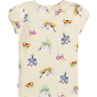 Beigefarbenes, eng anliegendes T-Shirt aus weicher Öko-Baumwolle mit Rundhalsausschnitt und kleinen kurzen Puffärmeln. Das T-Shirt hat einen Druck von Tieren mit Blumenhüten.