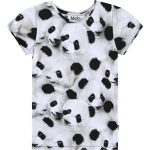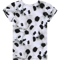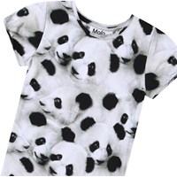 Eng anliegendes T-Shirt aus weicher Öko-Baumwolle mit einem Rundhalsausschnitt und kleinen Puffärmeln. Das T-Shirt ist mit einem Panda-Print in Schwarz-Weiß-Tönen versehen.