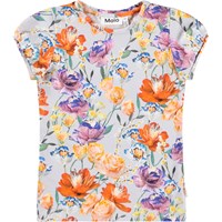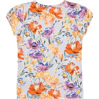 Hellblaues, figurbetontes T-Shirt aus weicher Bio-Baumwolle mit Rundhalsausschnitt und kleinen kurzen Puffärmeln. Das T-Shirt hat einen bunten Druck von Papierblumen.