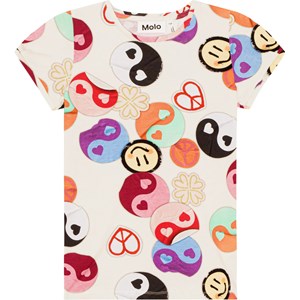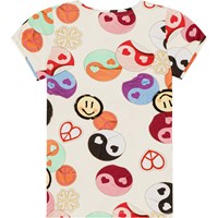Weißes T-Shirt aus Öko-Baumwolle mit einem mehrfarbigen Allover-Print aus Yin- und Yang-Aufklebern. Das T-Shirt hat einen Rundhalsausschnitt, kurze Puffärmel und eine körpernahe Passform.