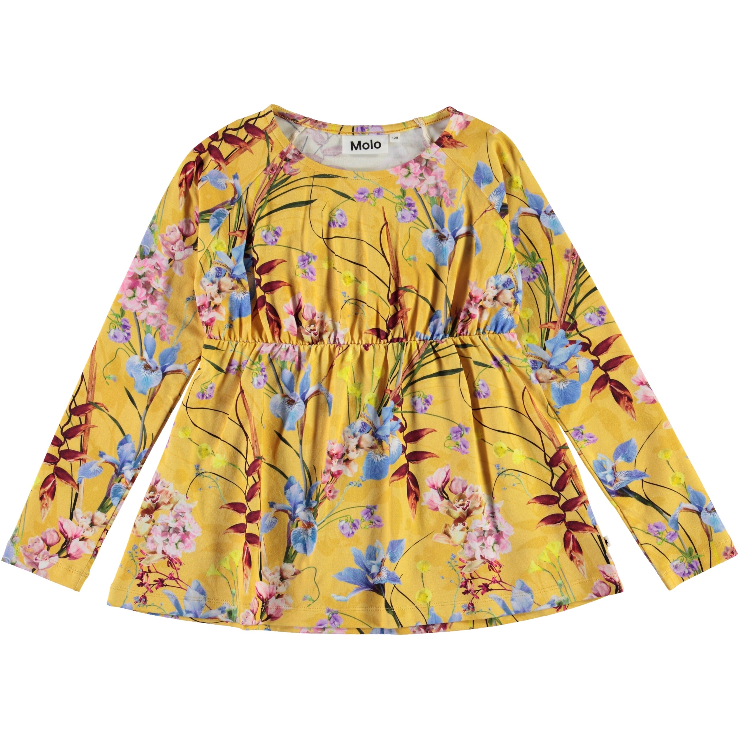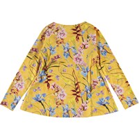 Rina ist eine langärmlige Jersey-Bluse in Gelb mit einem wunderschönen Blumen-Druck. Rina hat lange Ärmel und eine elastische Taille, die einen femininen Schnitt ergibt.