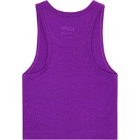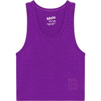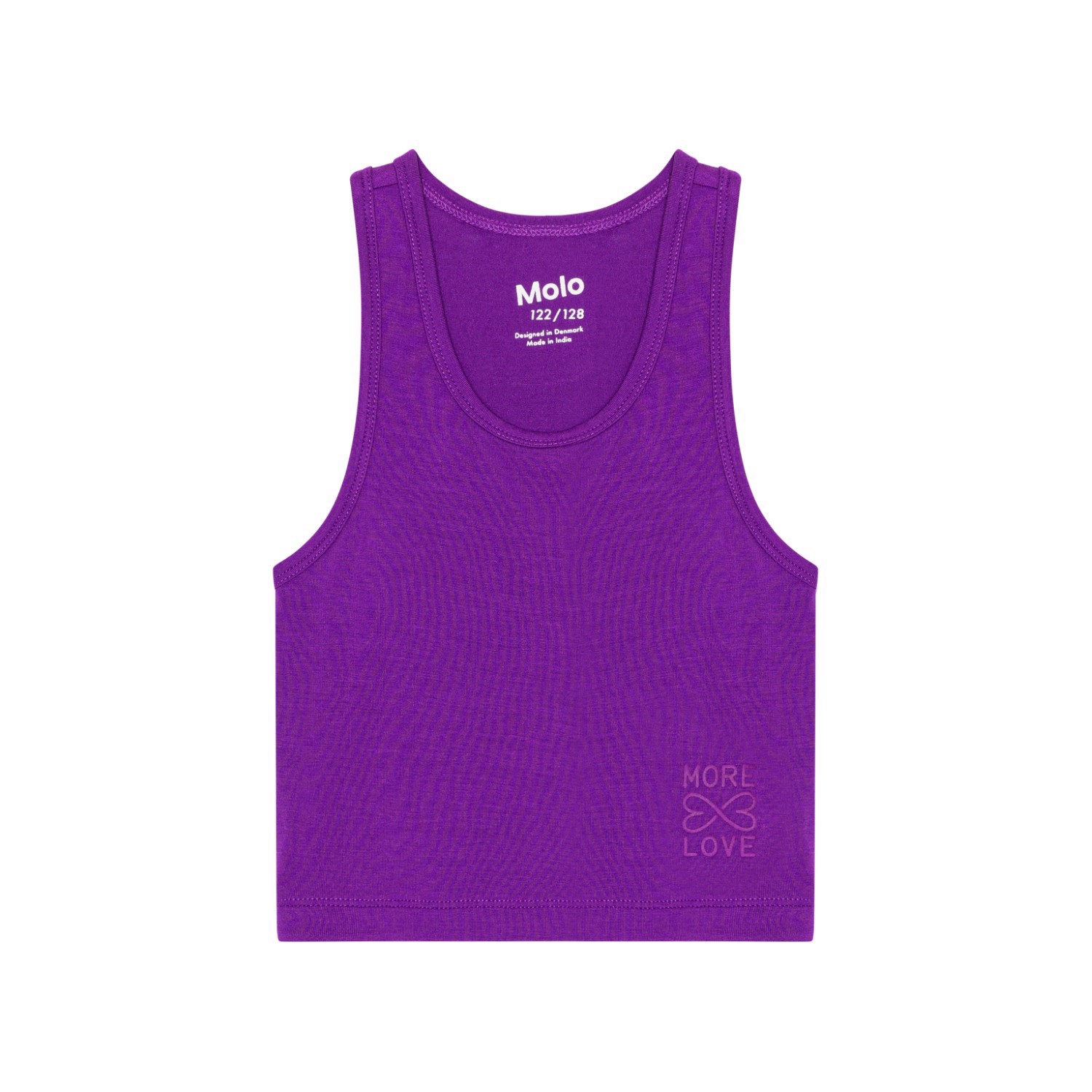 Lila, kurzes Tanktop aus weicher Viskose. Das Oberteil hat tiefe Armausschnitte und einen dezenten Aufdruck „More Love“ auf der Vorderseite.