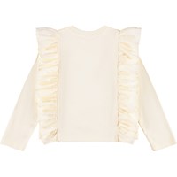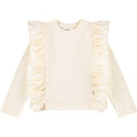 Off-weißes Langarmshirt aus Bio-Baumwolle mit Rundhalsausschnitt. Das eng anliegende Langarmshirt hat Rüschen vorne und hinten sowie über den Schultern.