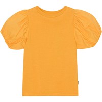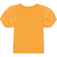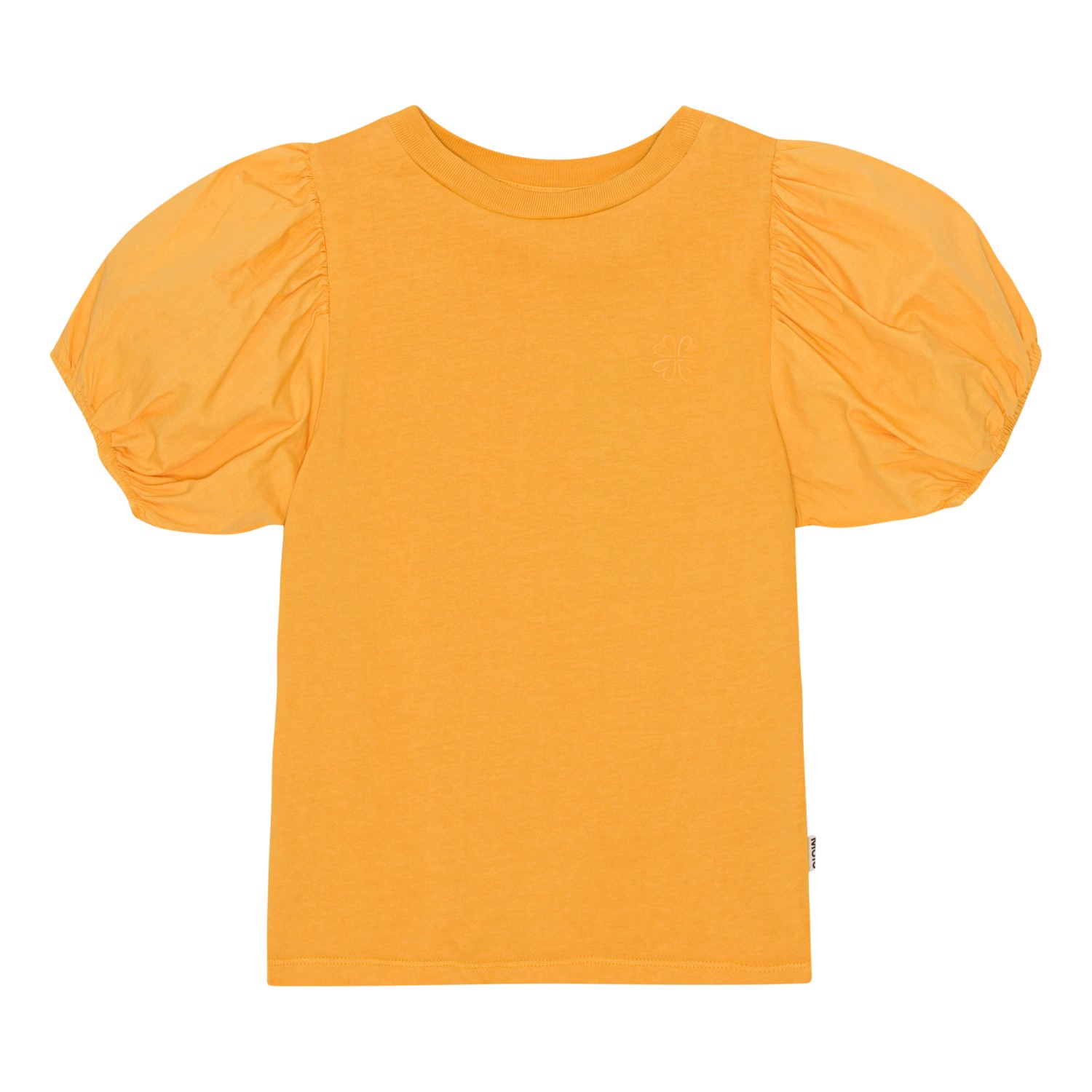 Orangefarbenes T-Shirt aus weichem Öko-Baumwolljersey mit voluminösen, kurzen Ärmeln aus Popeline. Kleiner Aufdruck auf der Brust mit vier kleeblattförmig angeordneten Herzen.