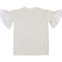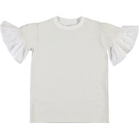 Ritta ist ein perlmuttfarbenes T-Shirt mit Rüschen an den Ärmeln.