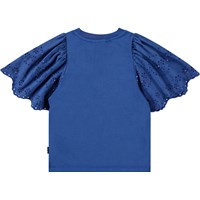 Dunkelblaues T-Shirt aus weicher Öko-Baumwolle mit geripptem Ausschnitt. Das T-Shirt hat eine lockere Passform und große Ärmel mit Broderie Anglaise, die sich schön im festen Baumwollstoff drapieren. Kombinieren Sie es mit einem passenden Rock für ein komplettes Set.