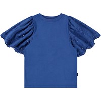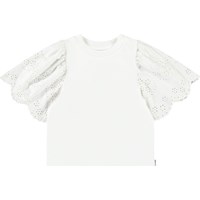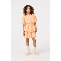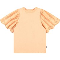 Hellorangenes T-Shirt aus weicher Öko-Baumwolle mit geripptem Ausschnitt. Das T-Shirt hat eine lockere Passform und große Ärmel mit Broderie Anglaise, die schön im festen Baumwollstoff fällt. Kombinieren Sie es mit einem passenden Rock für ein komplettes Set.