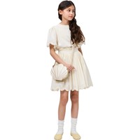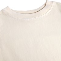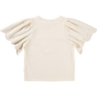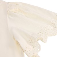 Beiges T-Shirt aus weicher Öko-Baumwolle mit geripptem Halsausschnitt. Das T-Shirt hat eine lockere Passform und große Ärmel mit Broderie Anglaise, die sich wunderschön im robusten Baumwollstoff drapieren.