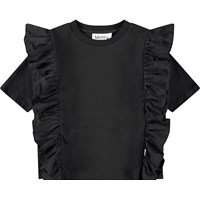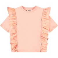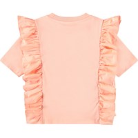 Hellorangefarbenes T-Shirt aus weicher Öko-Baumwolle mit geripptem Ausschnitt. Das T-Shirt hat eine lockere Passform und Rüschen-Detail, das über die Schulter und auf der Vorder- und Rückseite verläuft.