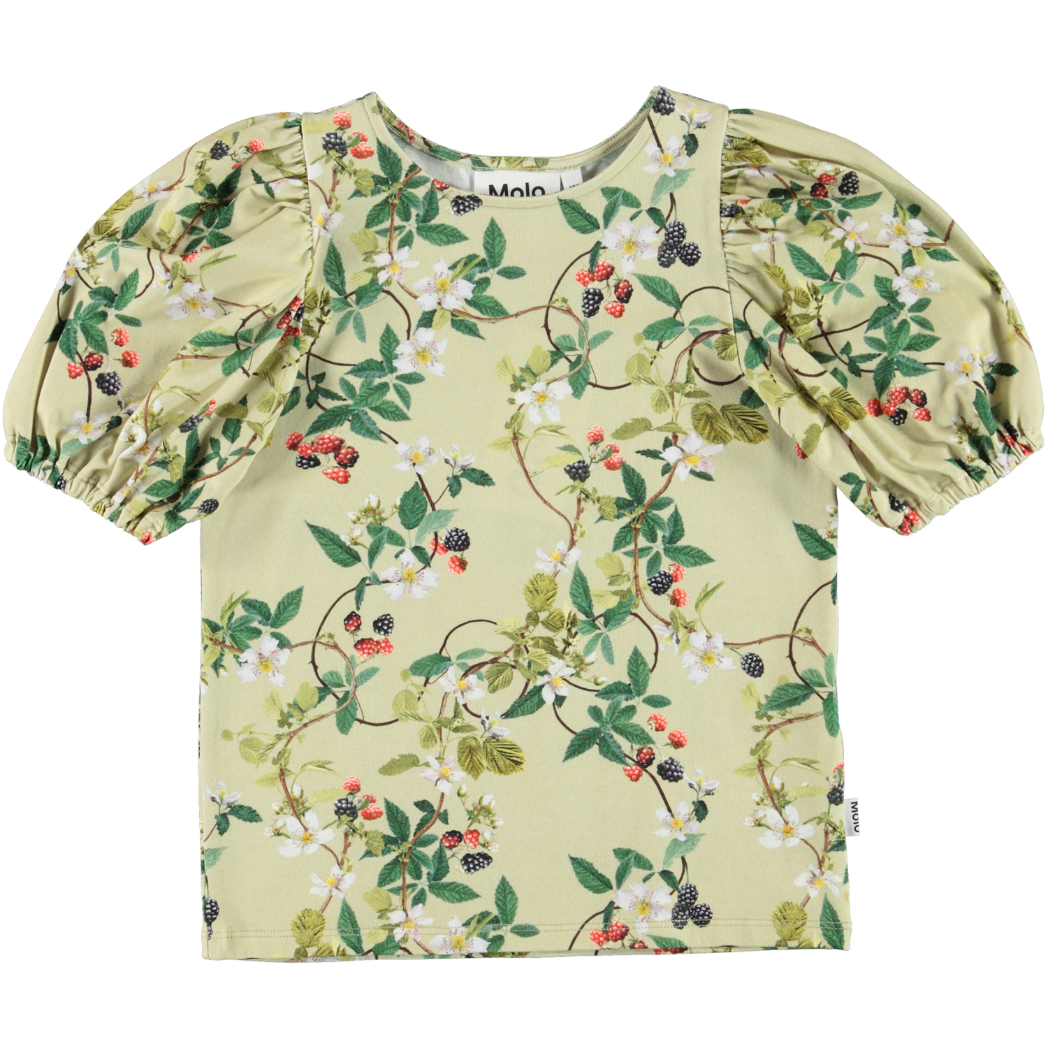 Rivera ist eine hellgrüne Bluse mit Puffärmeln und einem Aufdruck von Brombeerranken. Die Bluse hat einen Rundhalsausschnitt und einen elastischen Abschluss am Ärmelende, wodurch der Ärmel perfekt sitzt.