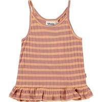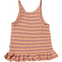 Riza in Papaya Rose ist ein lockeres, geripptes Sonnentop mit Trägern und Streifen in Orange und Altrosa. Unten hat das Oberteil eine Rüsche aus dem gleichen Stoff, was das Oberteil sowohl hübsch als auch lustig macht.