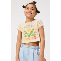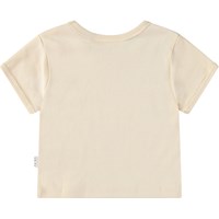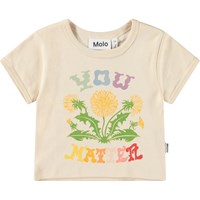 Beiges bauchfreies T-Shirt aus Öko-Baumwolle mit Rundhalsausschnitt und gerippten Kanten. Das T-Shirt ist figurbetont geschnitten und hat einen Frontdruck von blühenden Löwenzahnen und dem Text 'You matter'.