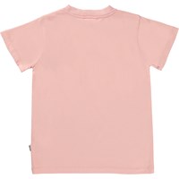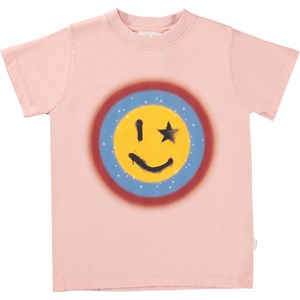 Road ist ein rosafarbenes T-Shirt mit einem Smiley-Print auf der Vorderseite.
